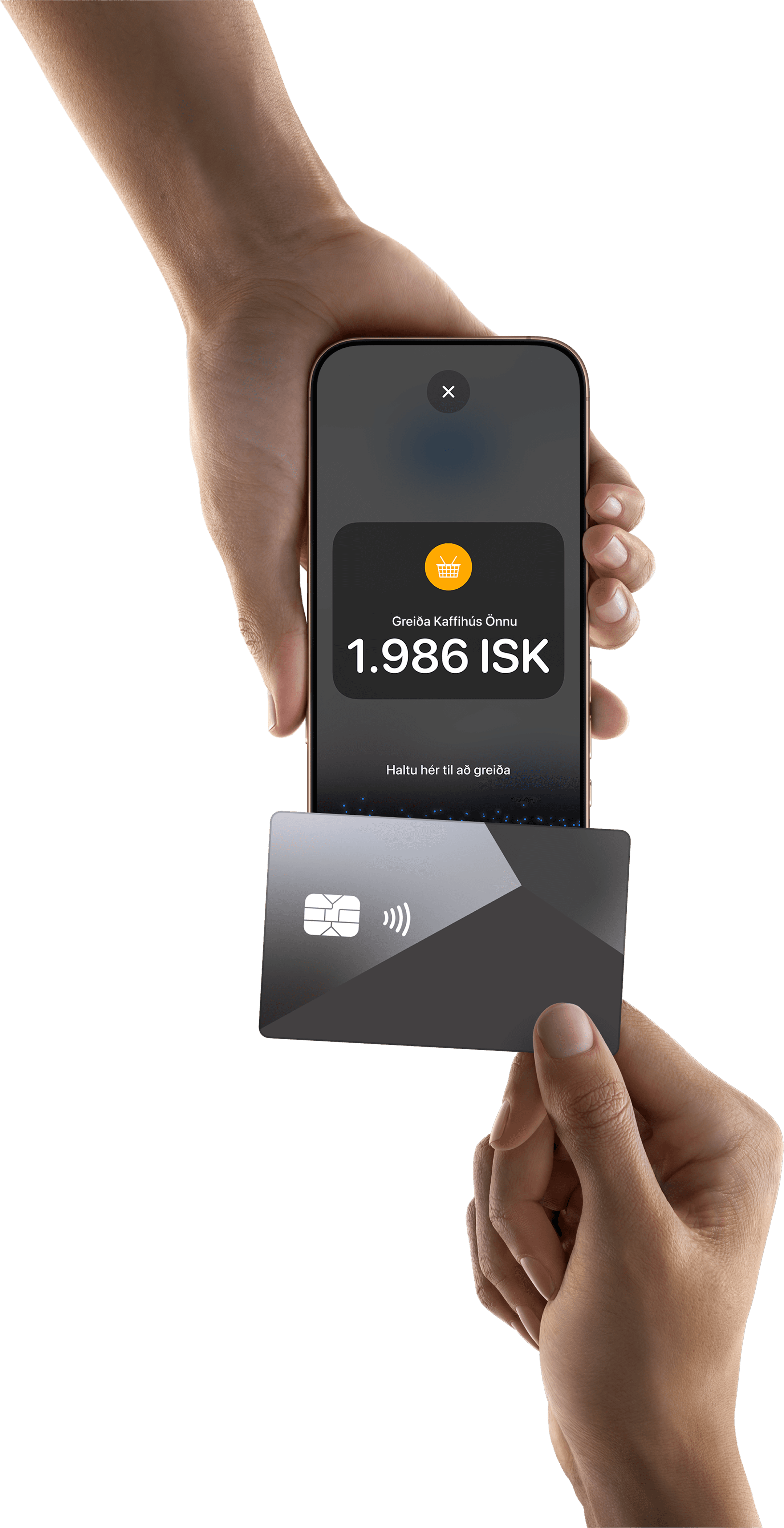 • Viðskiptavinurinn heldur korti eða stafrænu veski lárétt yfir snertilausa tákninu í nokkrar sekúndur, þar til það kemur melding um að færsla sé heimiluð.